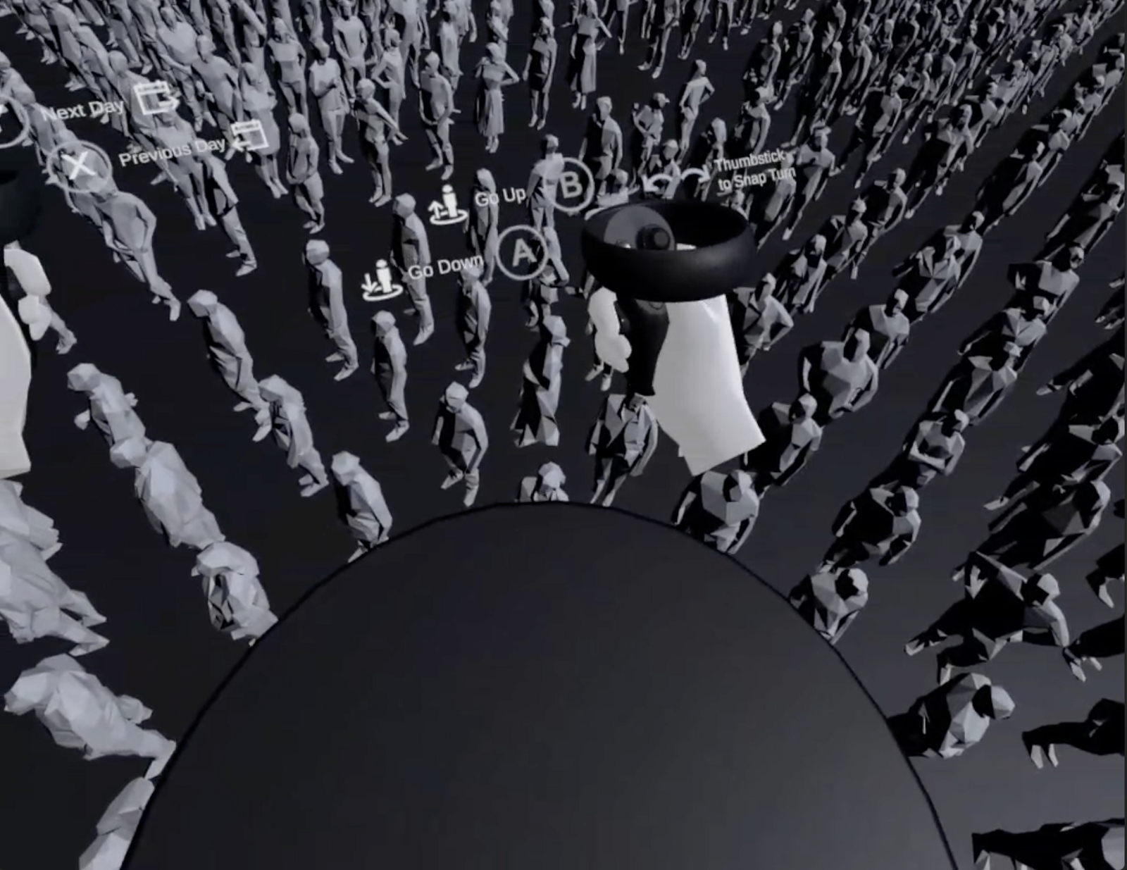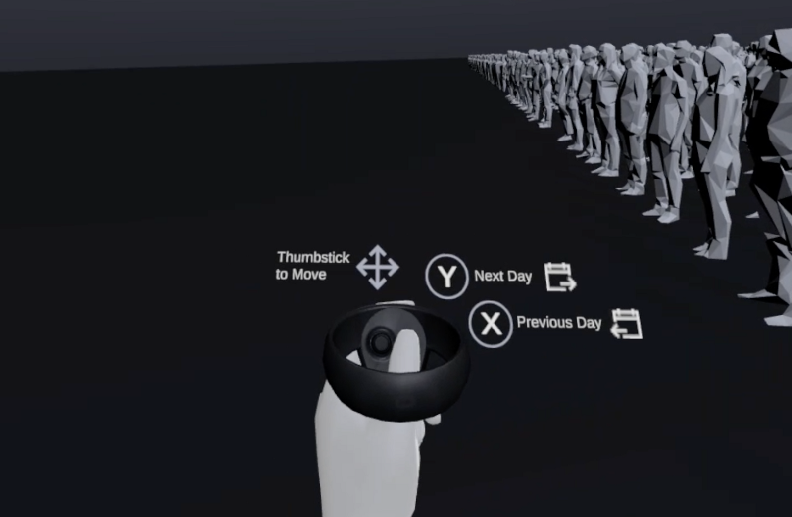 I had a few interactions in addition to basic locomotion. You can use X and Y to select previous or next day, and B/A to go up or down. I decided to add how-to next to the controllers.