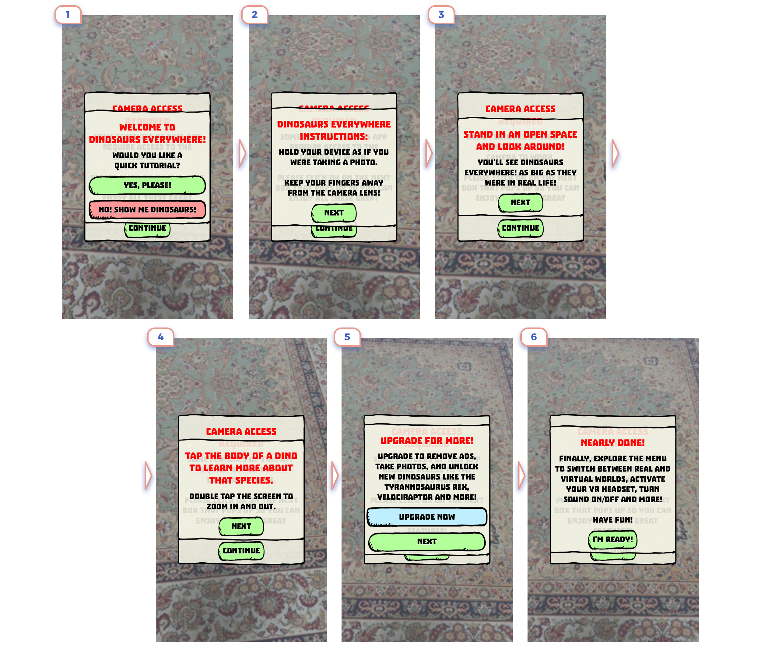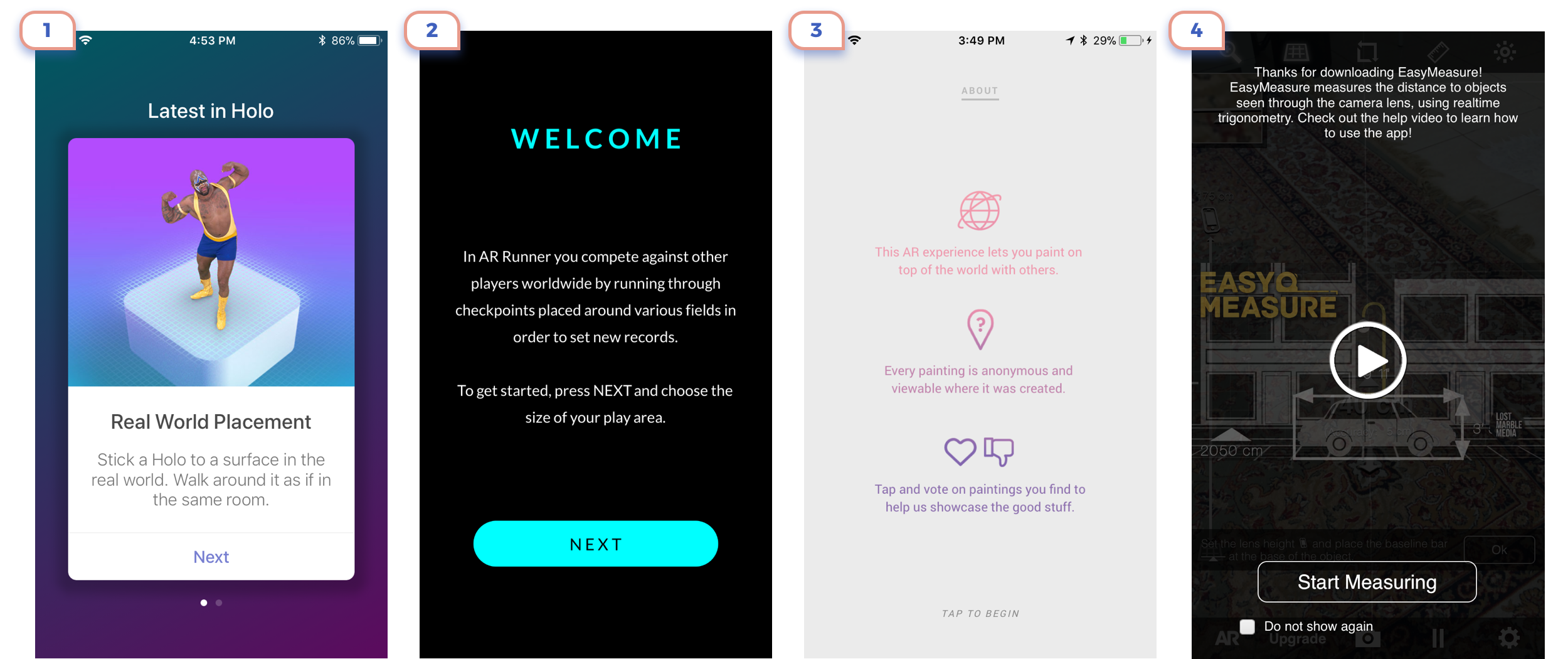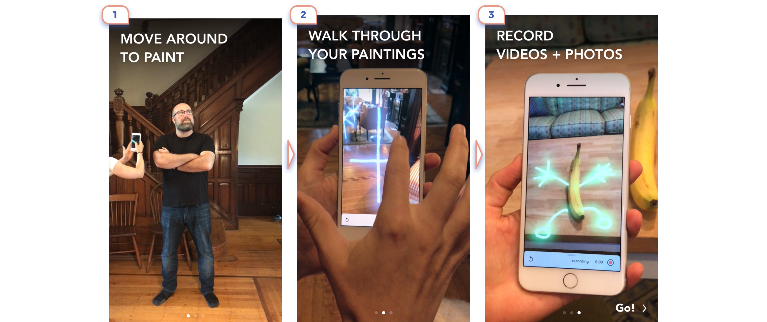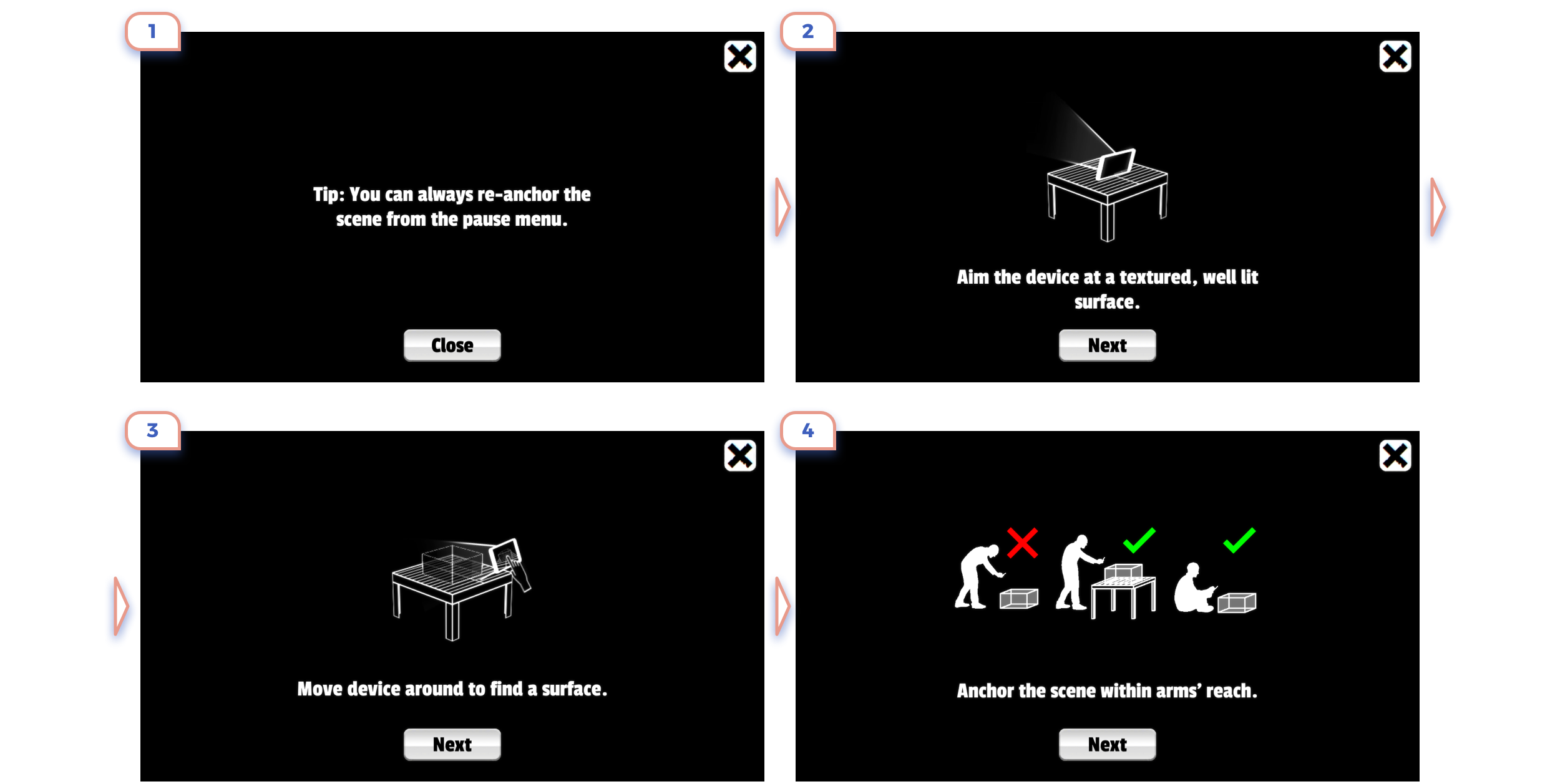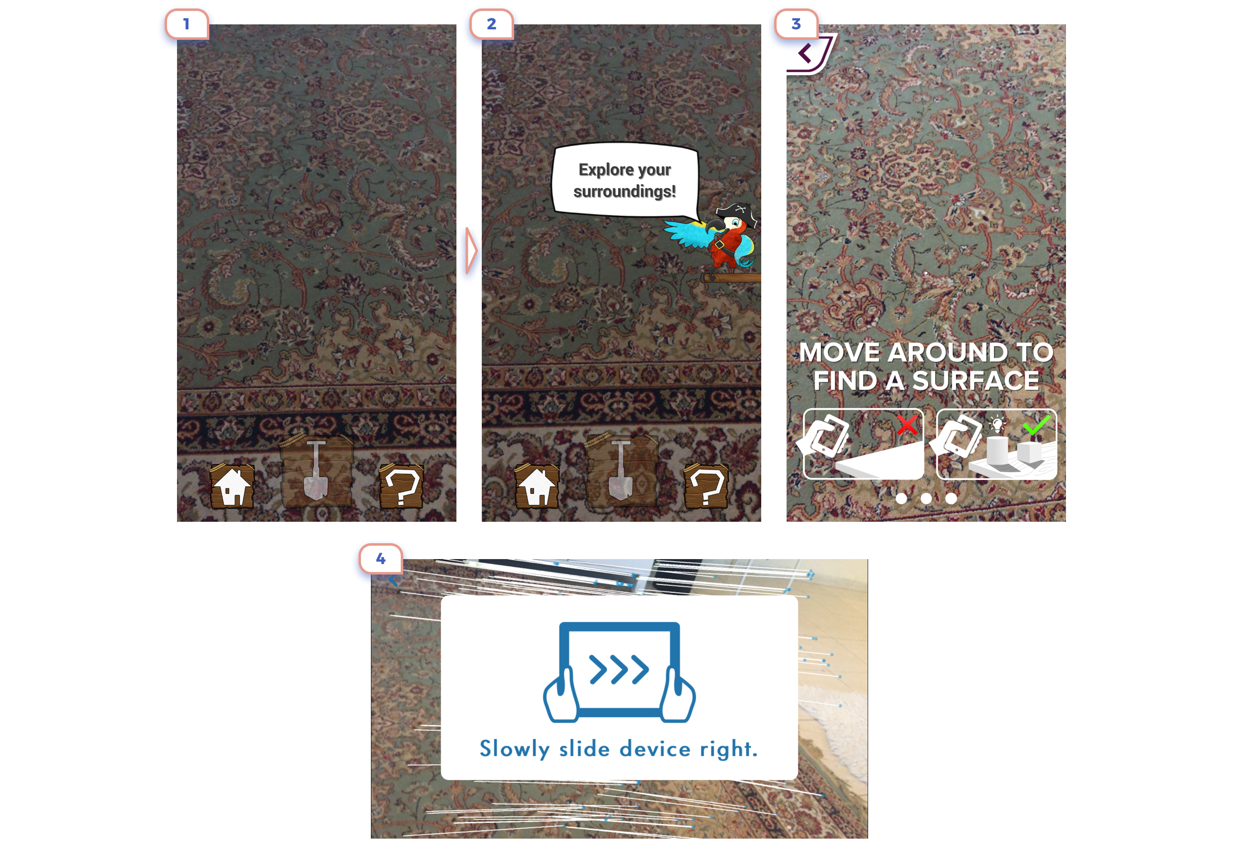 This is the perfect example. Only in 3 steps they show the main idea of what is AR about, explained that there are unique controls, and promoted app feature.