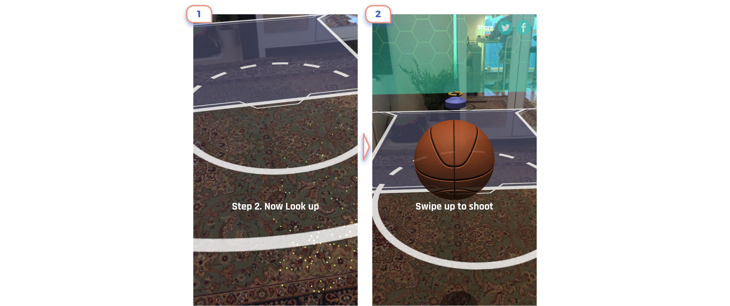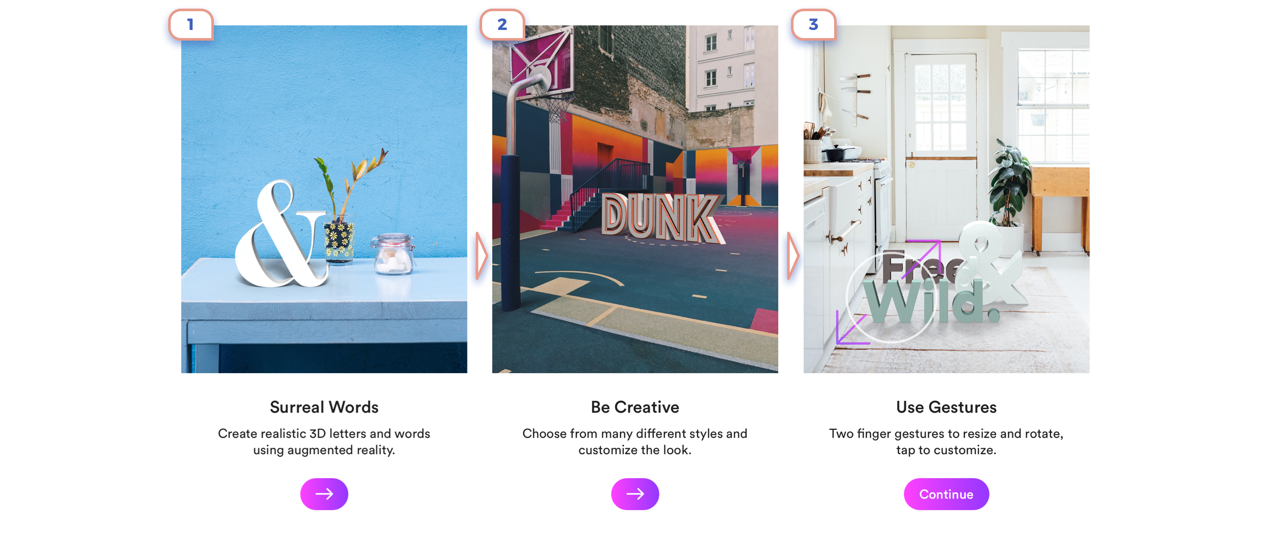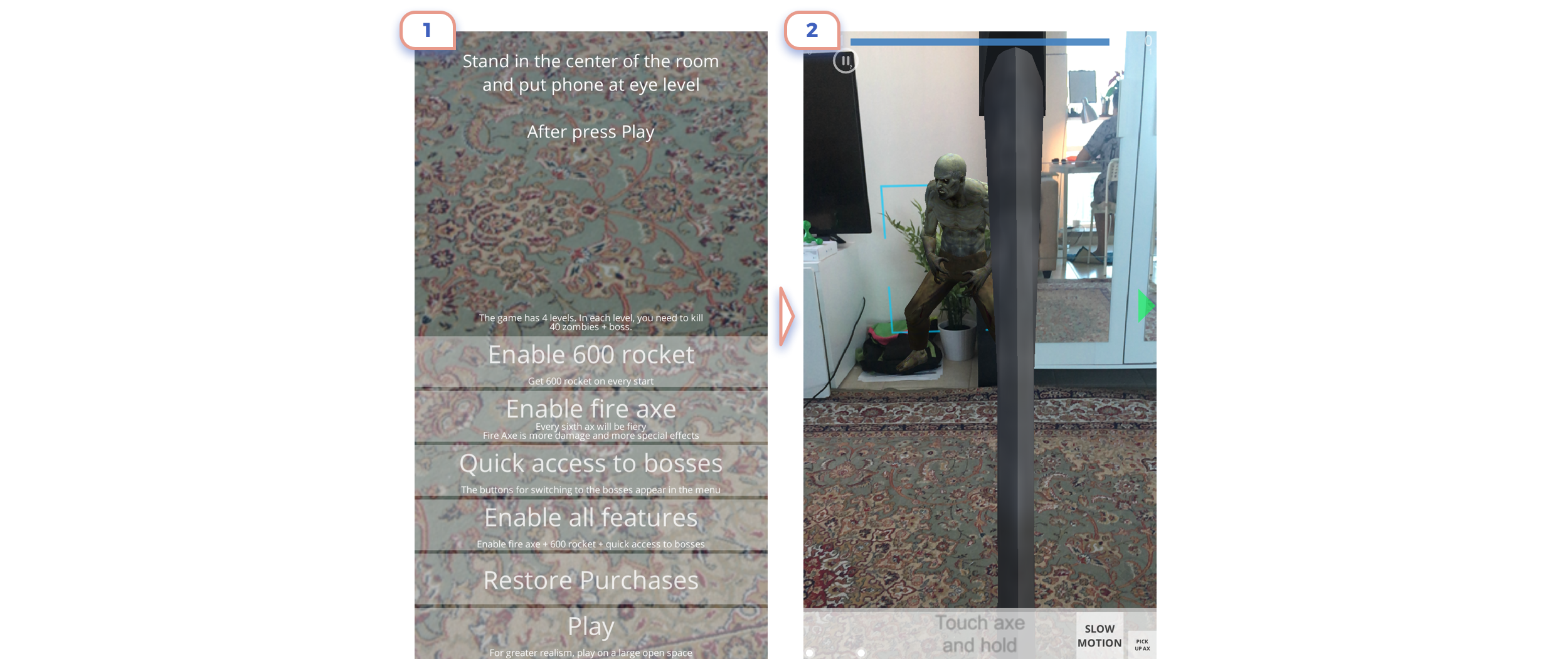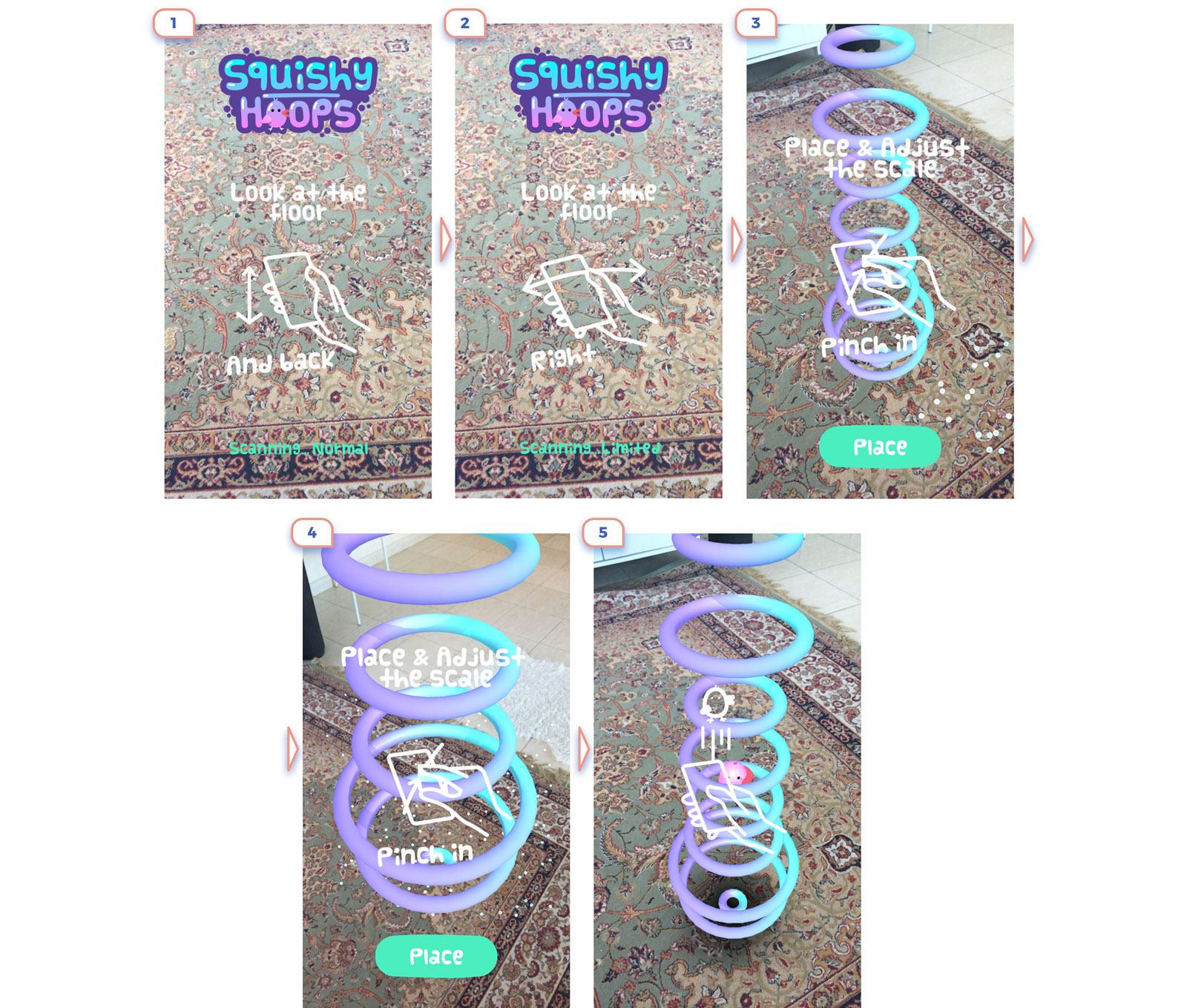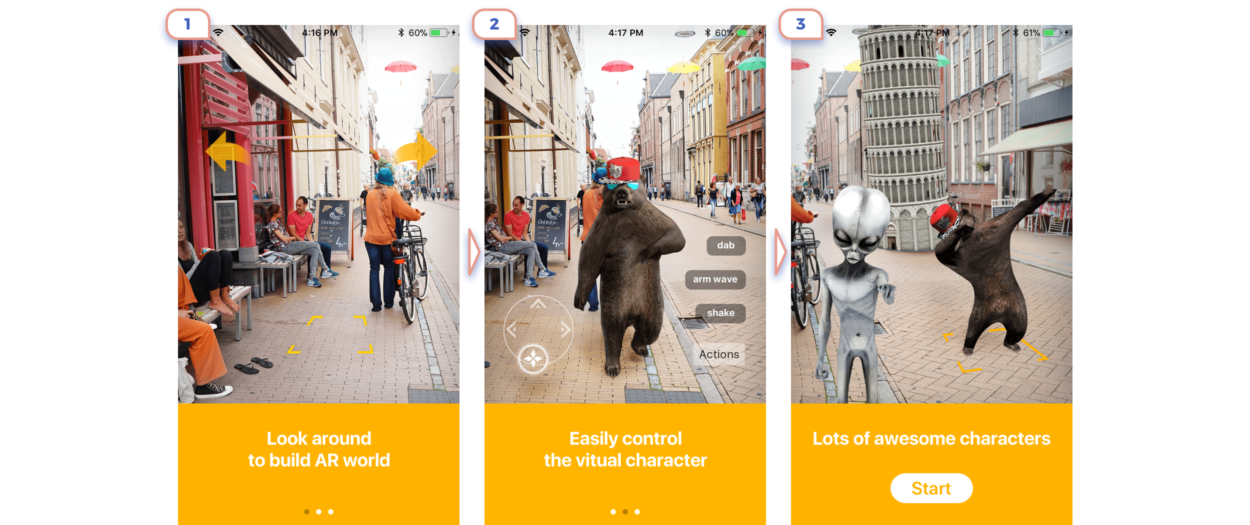 This is the perfect example. Only in 3 steps they show the main idea of what is AR about, explained that there are unique controls, and promoted app feature.