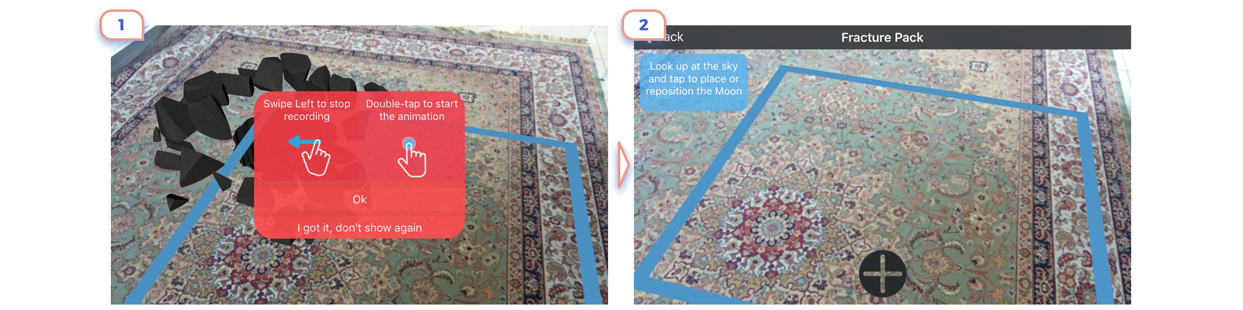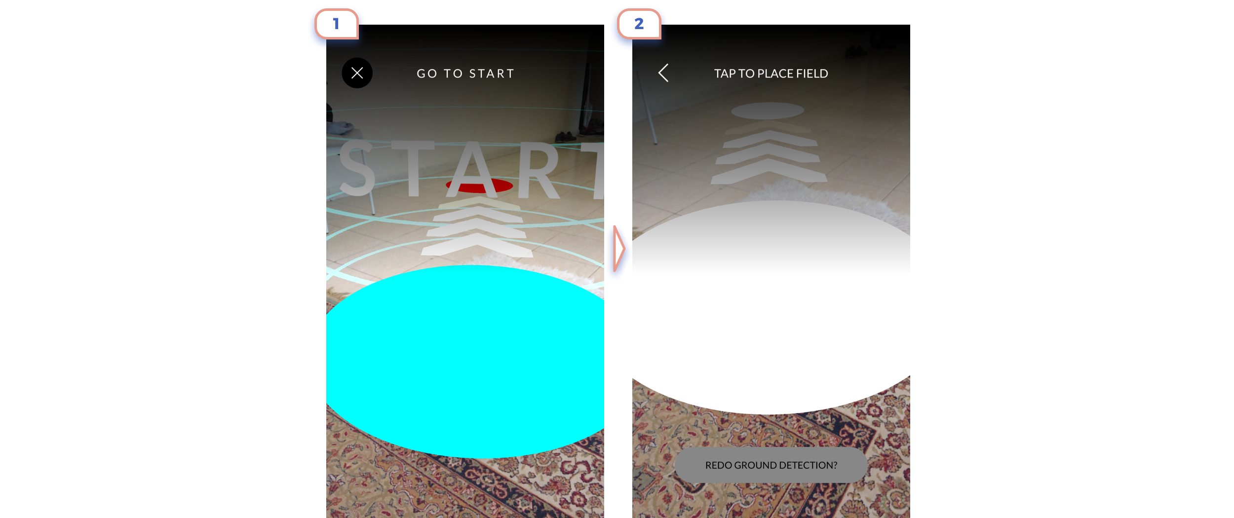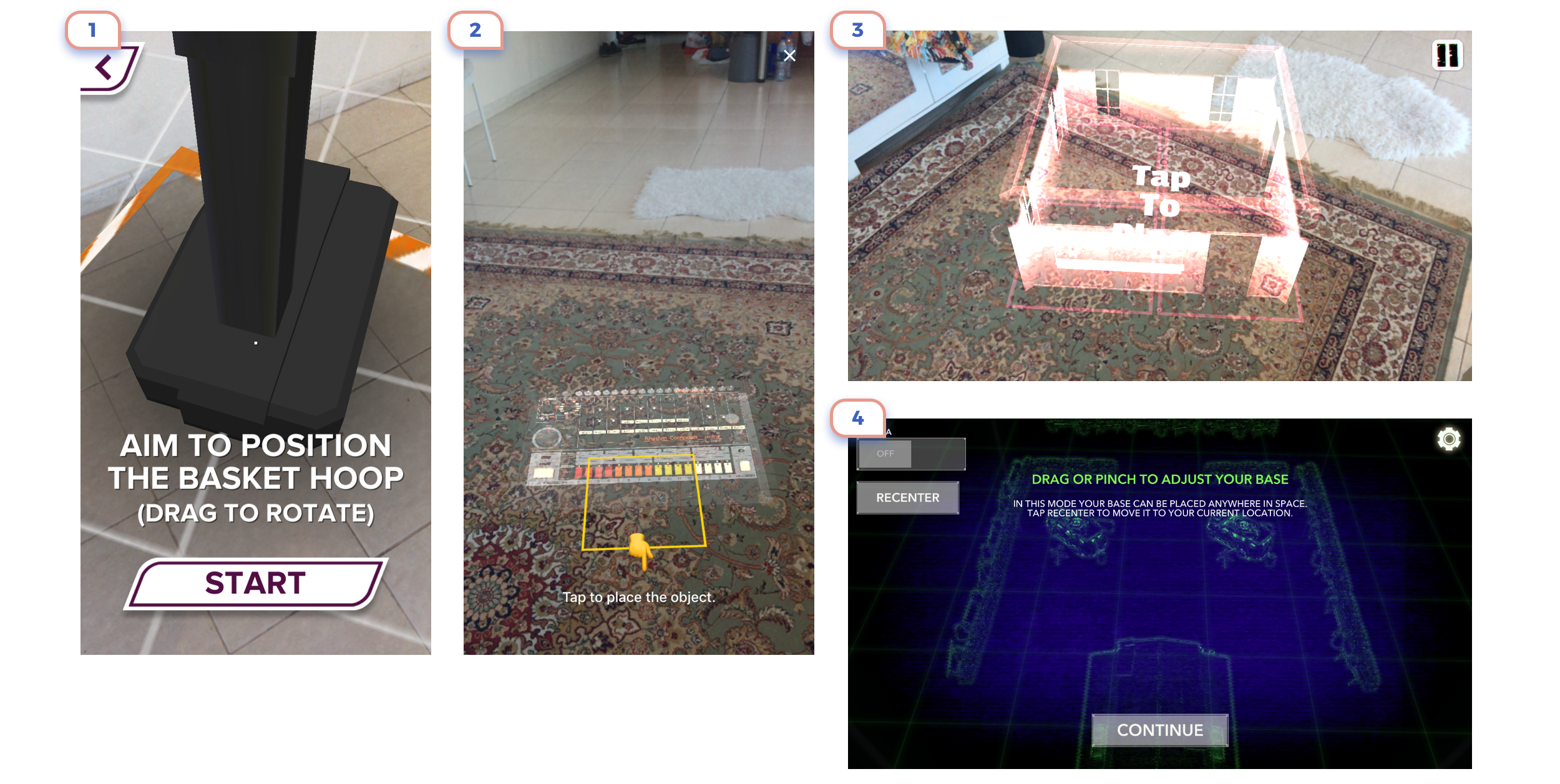On first example you’ll assume that you should tab white button, But not, you should tap “+” icon in the right corner to place an object. On the second screen, you should tap on a screen to put an object, not on this attractive button.
