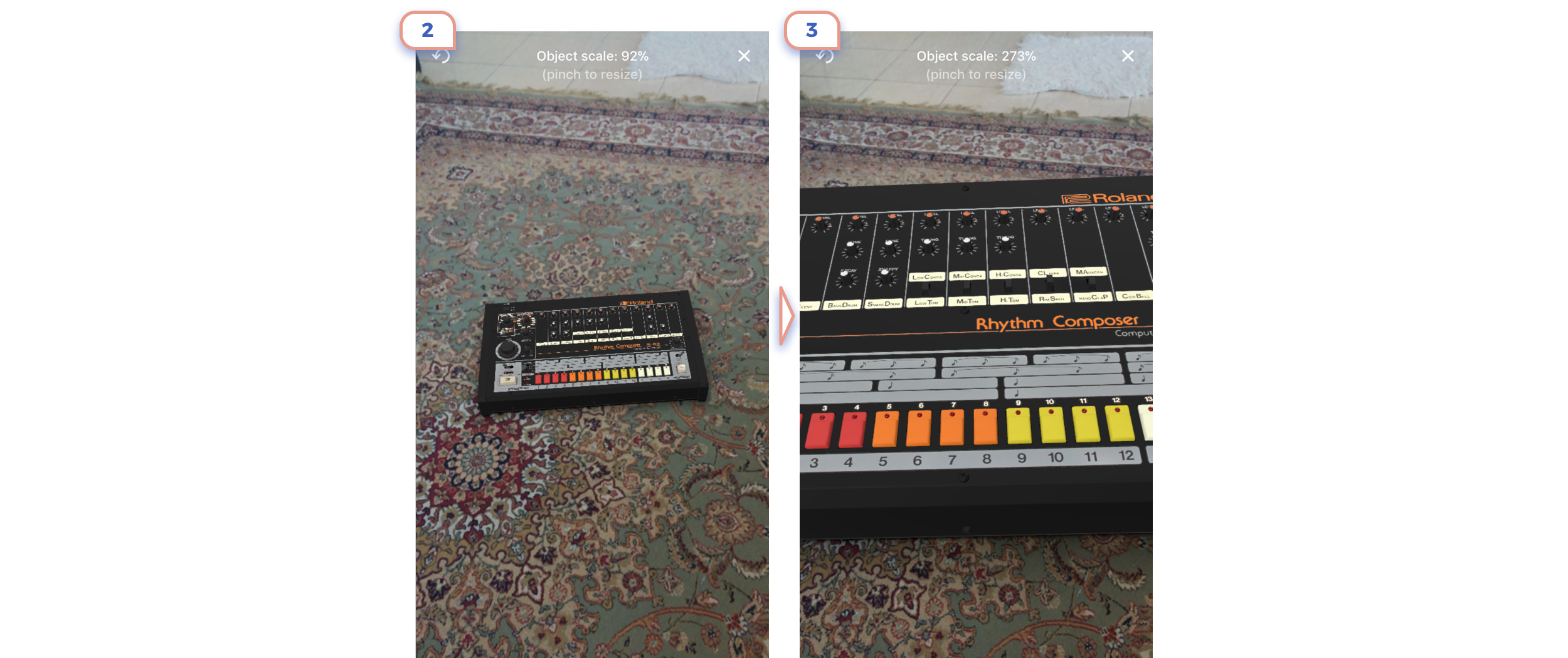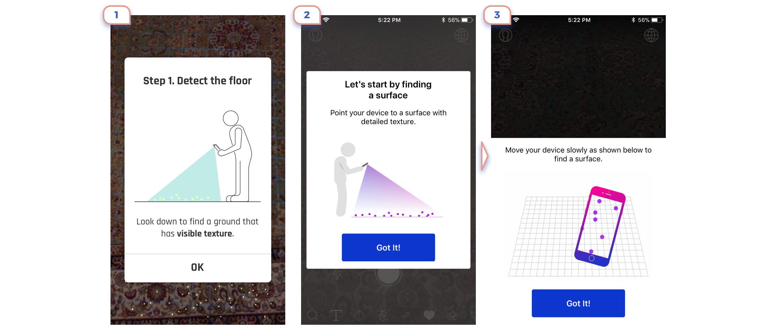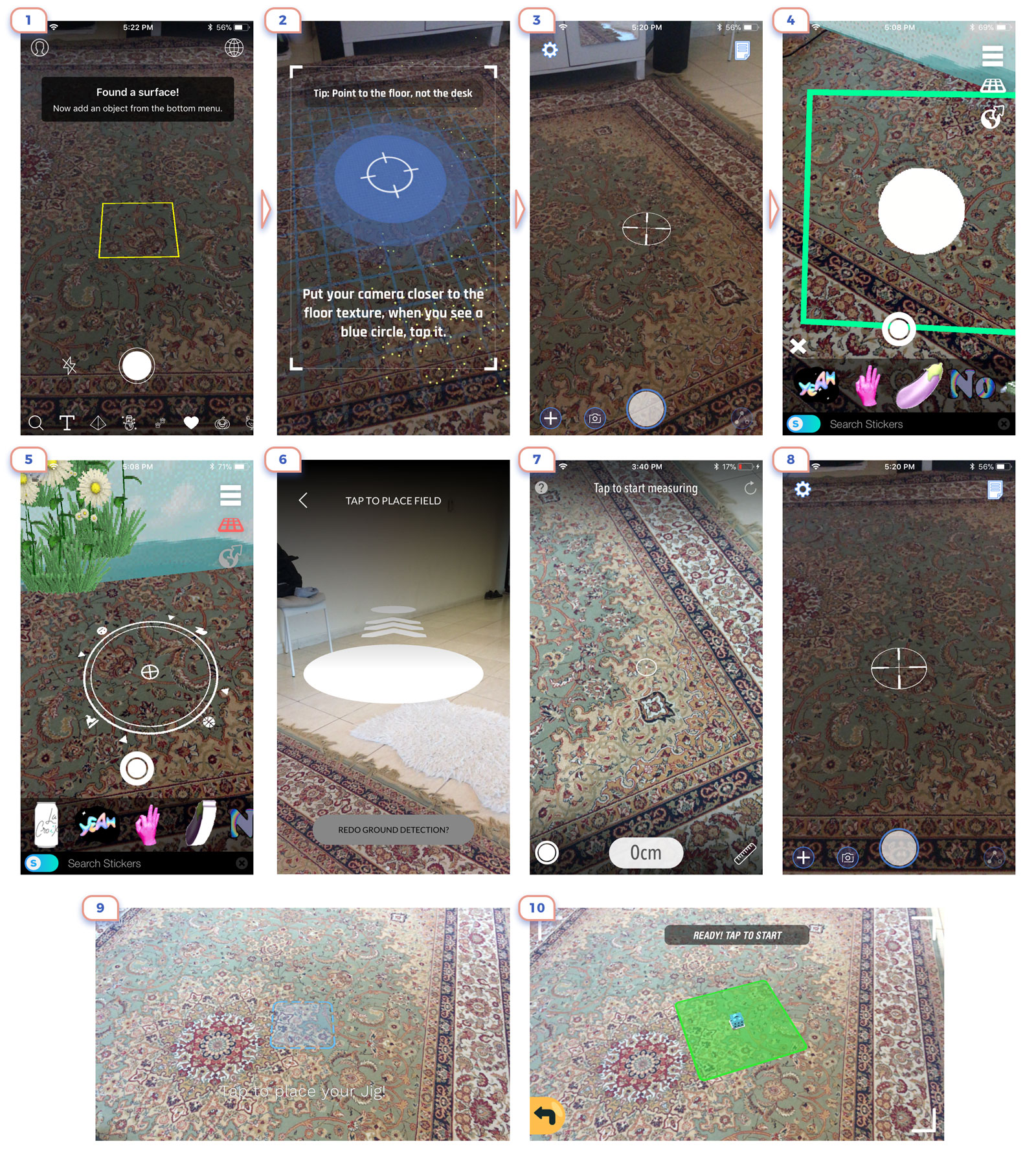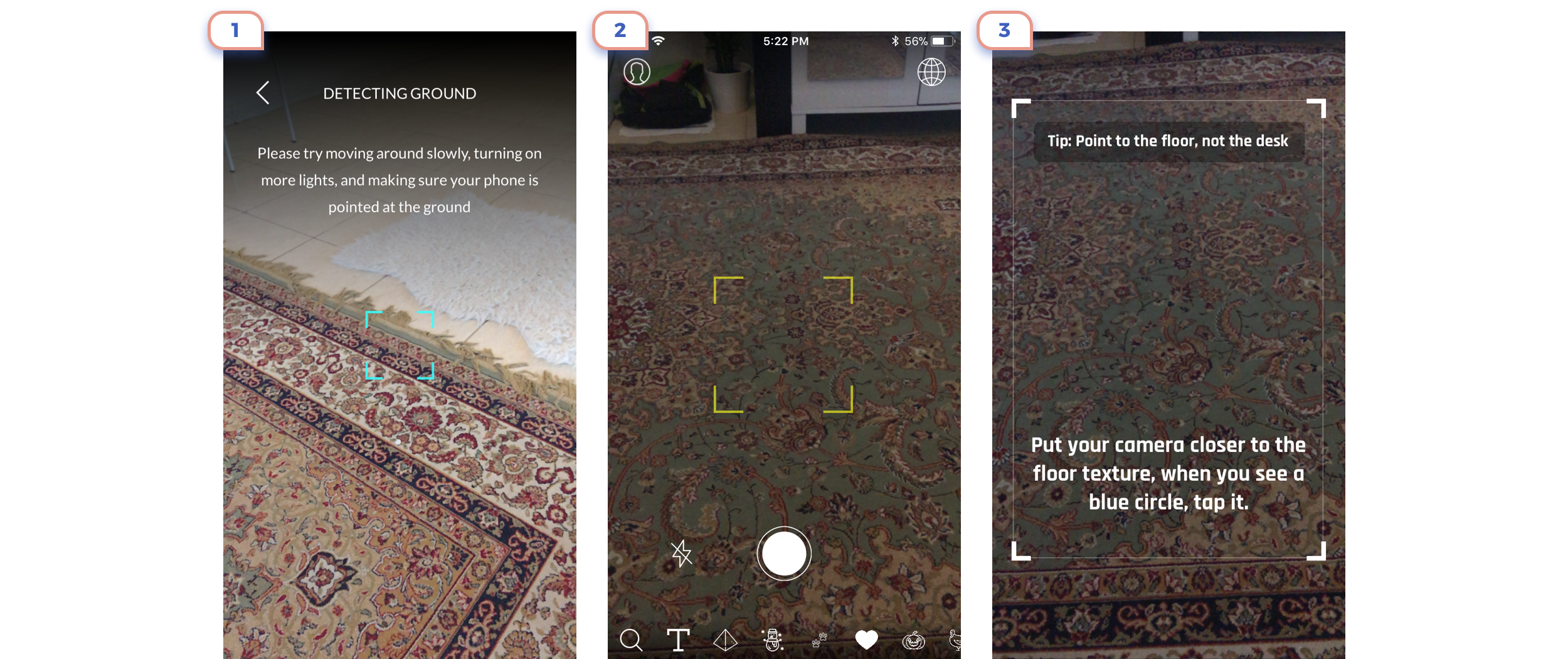 On first example you’ll assume that you should tab white button, But not, you should tap “+” icon in the right corner to place an object. On the second screen, you should tap on a screen to put an object, not on this attractive button.