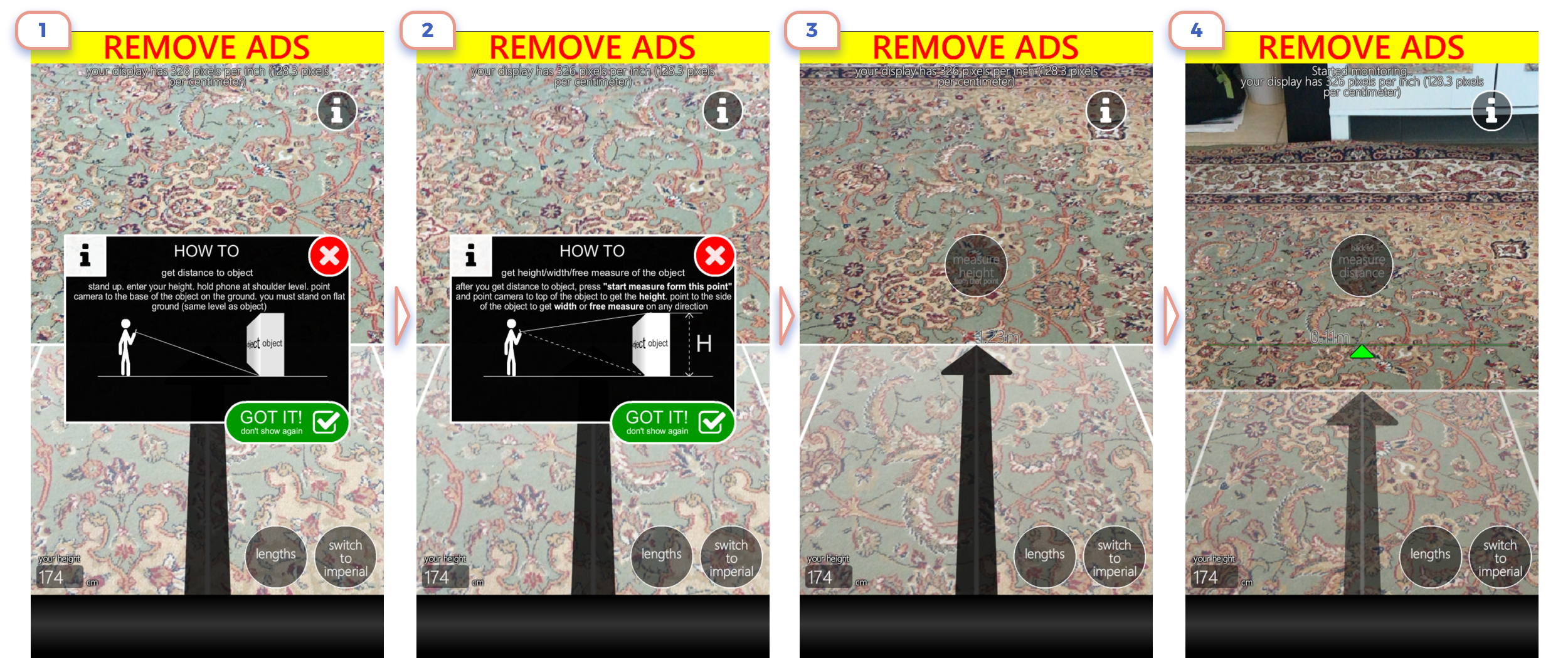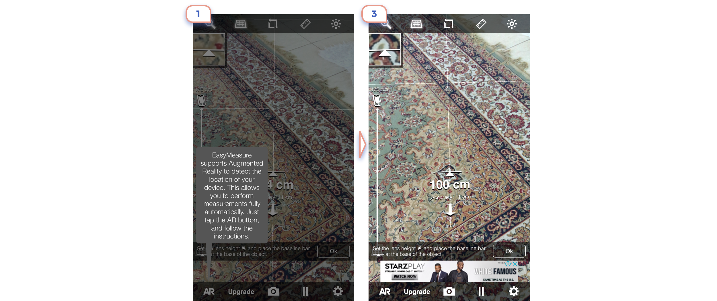 4. Again unreadable text on a top. This is the interesting case, as on-screen are two CTA: one starts playing video, another is “Start Measuring”. And not clear what is more important. I would like to know how many users started playing a video at all. Let’s be honest, no one wants to watch a video when he is few steps away from exciting augmented reality.
